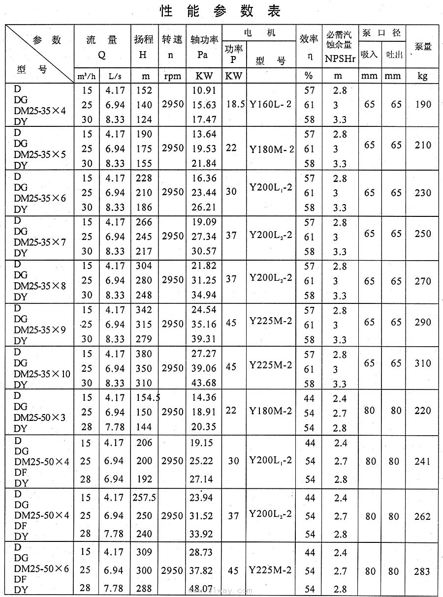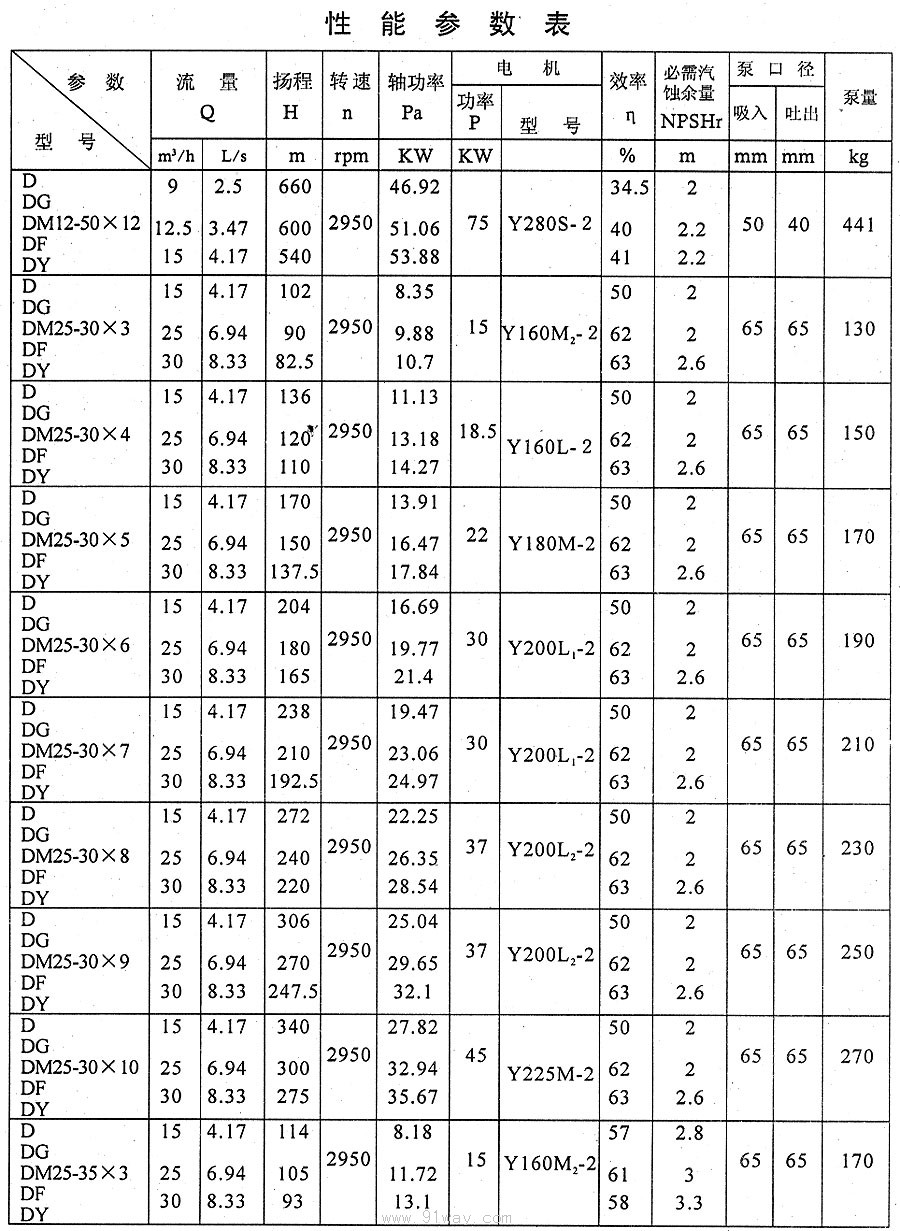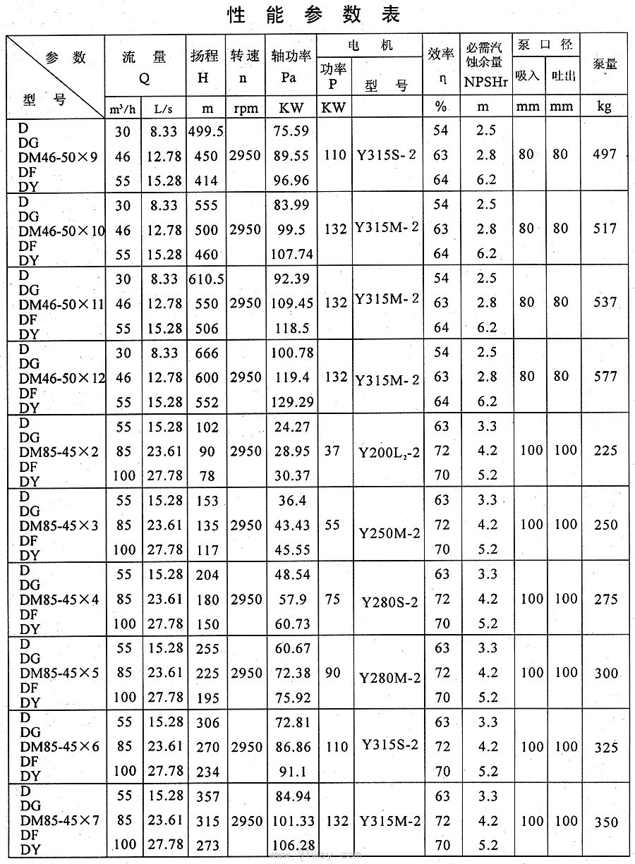 D、DG、DM、DF、DY型多級離心泵技術參數10