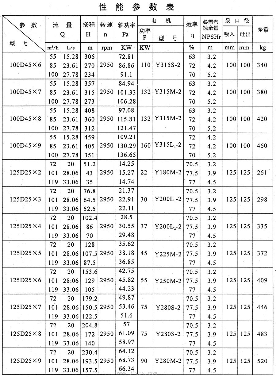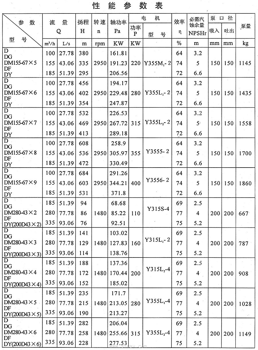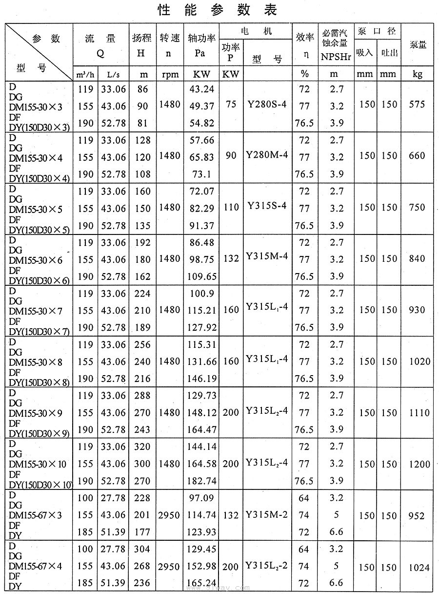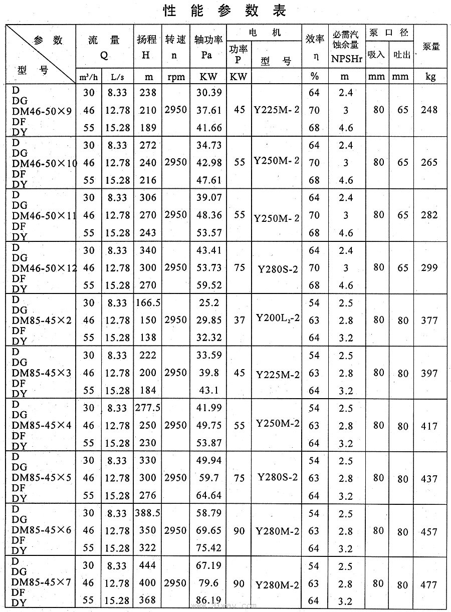 D、DG、DM、DF、DY型多級離心泵技術參數10