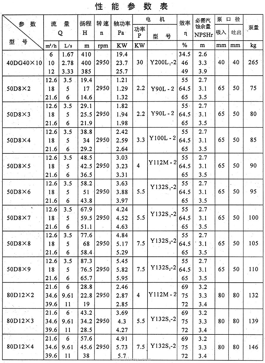 D、DG、DM、DF、DY型多級離心泵技術參數8
