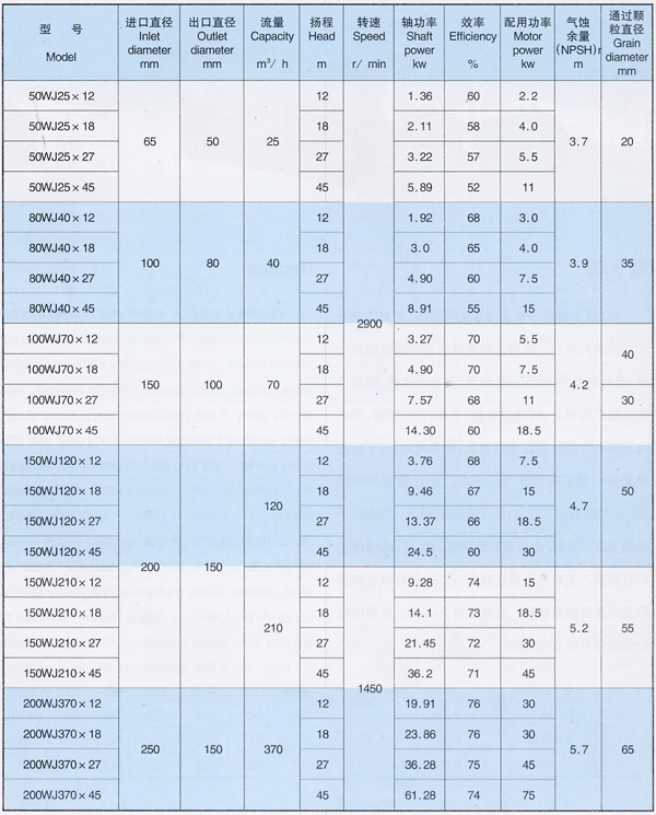 WJ系列無堵塞漿泵采用雙流道式葉輪、 各種纖維,顆粒通過性能好,具有無堵塞、輸漿濃度范圍廣。