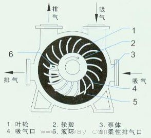 葉輪偏心地安裝在接近圓形的泵體內,當葉輪旋轉時,液體受離心力作用在泵體內壁形成一個旋轉的液環。在兩相鄰葉片、葉輪輪轂和液環內表面形成密閉的氣腔,在吸氣區,密閉氣腔體積逐漸增大.其內部壓力下降,氣體從吸氣口吸入,在排氣區,密閉氣腔體積逐漸減小,其內部壓力上升,氣體被壓縮,從排氣口排出:該過程反復連續進行。達到抽送氣體的目的。