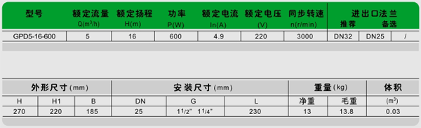 GPD5-16-600型單相管道屏蔽電泵技術數據: