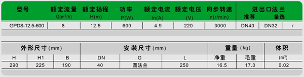 GPD8-12.5-600型單相管道屏蔽電泵技術數據: