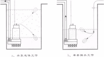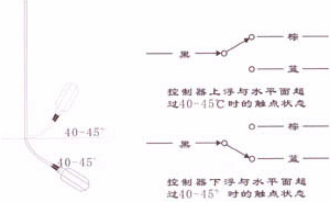 液位控制器電纜中有三根控制線,黑色 ( 輸入線 ) ,棕色和藍色 ( 輸出線 ) 。其中黑色線和棕色線是排水系統的控制線,當控制器上浮到設定位置,黑色線和棕色線觸頭接通,輸出開泵信號;控制器下降到設定位置,黑色線和棕色線觸頭分開,終止開泵信號。而黑 色線和藍色線是給水系統的控制線,當控制器下降到設定位置,黑色線和藍色線觸頭接通,輸出開泵信號,控制器上浮到設定位置,黑色線和藍色線觸頭斷開,終止開泵信號。也可以采用多套控制器串聯方式來控制水泵,防止控制器在工作中失常而損壞設備。