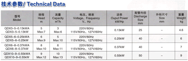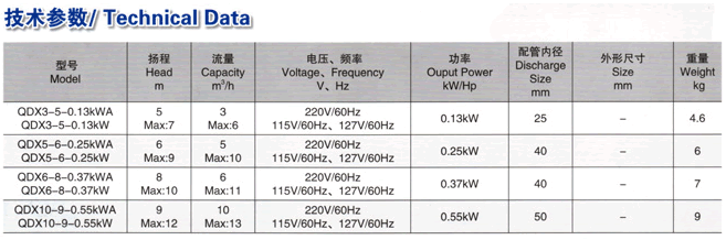 QDX單相塑料潛水泵技術參數:
