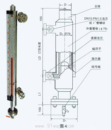UHZ-111/S防霜型電遠(yuǎn)傳磁浮子液位計(jì)用于低溫液體液位計(jì)外結(jié)冰而設(shè)計(jì)的專利產(chǎn)品。它和右圖不同的是沒有保溫蒸汽接口法蘭,而保溫夾套內(nèi)是真空層,因而能有效地隔離冷、熱傳導(dǎo),從而保證了液位計(jì)主體管外不會結(jié)冰、結(jié)霜,從而保證了液位計(jì)的正常使用。