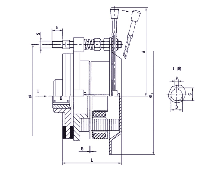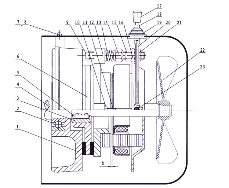 1、后端蓋2、軸承3、花鍵襯套4、轉(zhuǎn)子5、普通平鍵6、制動盤7、十字螺釘8、彈簧墊圈9、螺桿10、螺母11、拉桿螺釘12、銜鐵板13、制動彈簧14、保險螺母15、螺母16、磁軛17、膠木手柄18、手柄螺母19、防塵蓋20、釋放環(huán)21、保險螺母22、風(fēng)扇23、復(fù)位彈簧δ、間隙