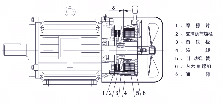 調(diào)整:選擇相對(duì)于制動(dòng)器工作間隙的塞尺厚度,先松開(kāi)支撐調(diào)節(jié)螺栓(2),將塞尺插入間隙(δ)內(nèi),盡量靠近支撐調(diào)節(jié)螺栓,用內(nèi)六角扳手將內(nèi)六角螺釘(6)向里旋壓住塞尺后,旋進(jìn)支撐調(diào)節(jié)螺栓(2),頂緊端蓋平面,再旋緊內(nèi)六角螺釘(6),拔出塞尺,再調(diào)其它點(diǎn)。