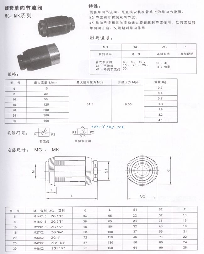 MG/MK節流閥/單向節流閥 旋套單向節流閥,是直接安裝在管路上的單向節流閥。 MG節流閥可實現雙向節流。 MK單向節流閥正向流動通過旋套起到節流作用,反向流動時單向閥開啟,又能起到單向作用。