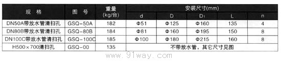 清掃孔裝于重質(zhì)油罐底部,清掃油罐進(jìn)要放出污水及掃除罐內(nèi)污泥,其中GSQ-50A、GSQ-80B、GSQ-100C,帶有放水管,出廠時(shí)不供應(yīng)孔頸及加強(qiáng)板。清掃孔