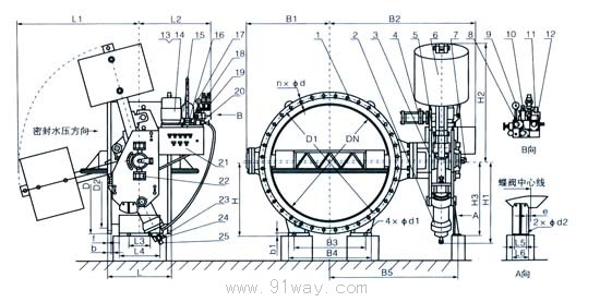 重錘式自動(dòng)保壓鎖定型液控緩閉止回蝶閥外形及連接尺寸圖DN≥600