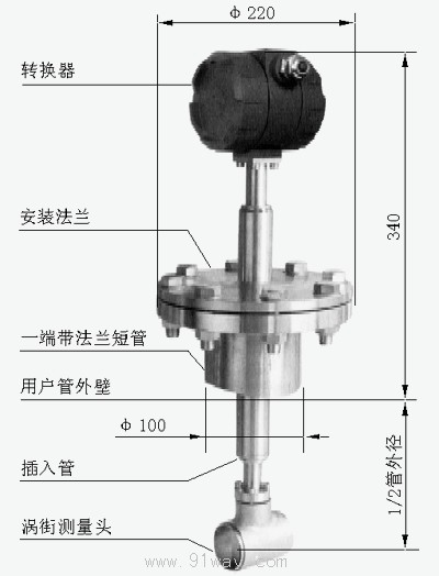 將渦街測量頭插入管道特定位置,通過測量該位置的局部流量,根據管道截面流速分布關系,計算出管道內平均流速值。它由轉換器、插入桿組件、球閥( 根據需求配 )、安裝短管(ф100)、渦街測量頭等組成。