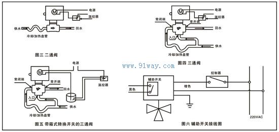 常閉二通閥和混合三通閥的安裝如圖形3、4所示。對于高層建筑物,應在底層支管上采用減壓閥。安裝閥體時,應注意閥體的箭頭指向,若帶有輔助開關,其接線如圖6所示。