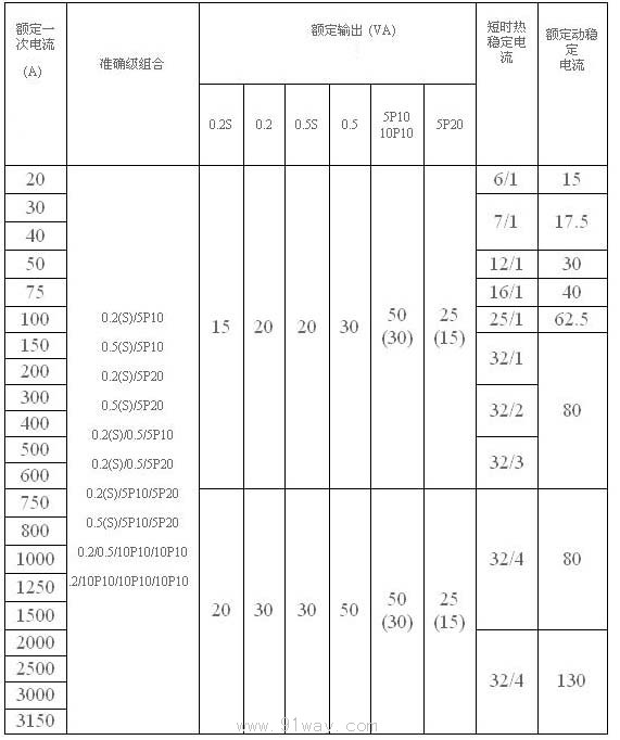 6. 額定一次電流、準確級組合、額定輸出及額定動、熱穩定電流見表