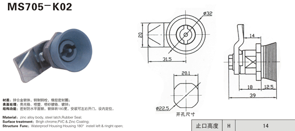 電柜門鎖MS705-KO2 材質;鋅合金鎖體,鋼制鋼栓,橡膠密封圈; 表面處理;亮光鉻、噴塑、噴砂鍍鉻、鍍鋅;