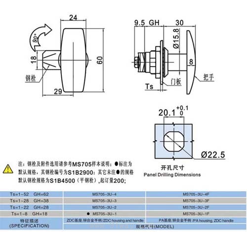 MS705-3U電柜門鎖外形尺寸及技術參數