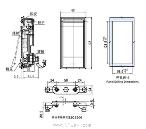 1.材質:鋅合金殼體、轉軸、手柄;鍍鋅鋼鋼栓、壓板;2.表面處理: 藍灰色;3.結構功能: 兩點鎖住結構,推拉式鎖蓋;殼內可安裝掛鎖;一般用于大型箱式柜門