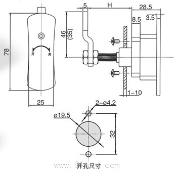 3.結構功能T型把手門鎖;鋼栓有收縮鎖緊功能;一般用于柜門密閉鎖緊用;調換鋼栓位置可左右開門通用;可調節止口高度;