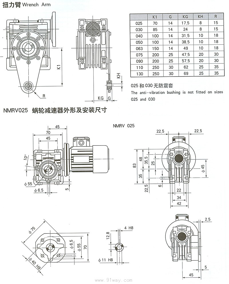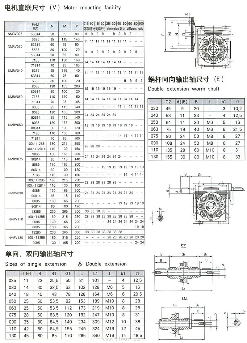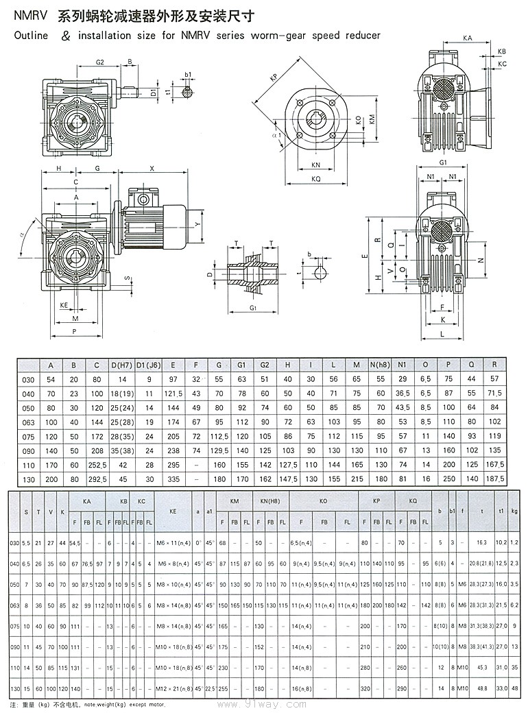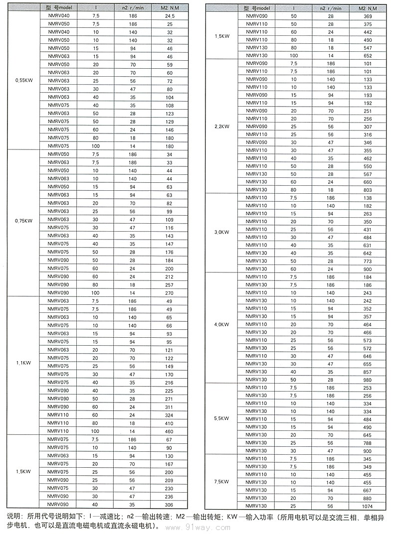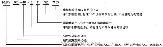 NMRV系列蝸輪減速電動機是由蝸輪減速器,與各種電機(包括三相交流、單項交流、直流伺服、永磁直流電機等)組合而成。產品在符合GB10085-88圓柱蝸輪參數基礎上吸收了國內外先進技術,形成方形鋁合金箱體,結構合理,外形美觀,散熱性能好,便于維修。 NMRV系列蝸輪減速電動機運行平穩,噪聲低,傳送速比大,運載能力強,且可配用多種類型電機,以實現調速拖動。 型號命名