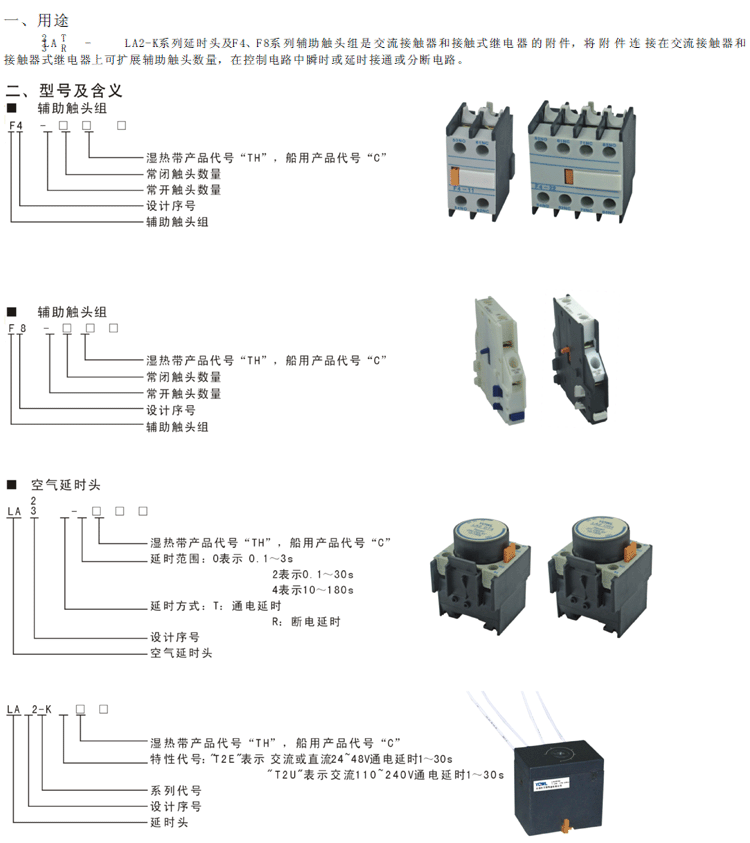 LA2、LA3系列空氣延時頭掛接在中間繼電器和交流接觸器上做為交流50HZ或60HZ額定電壓660V的自動控制線路和主回路的延時元件,按預定時間接通和分斷電路。